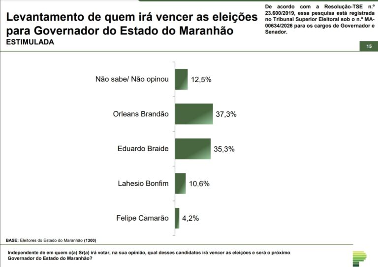 De acordo com os dados, Braide registra 34,6% das intenções de voto, enquanto Orleans Brandão aparece com 30,3%. Considerando a margem de erro de 2,8 pontos percentuais para mais ou para menos, os dois nomes estão tecnicamente empatados no levantamento.